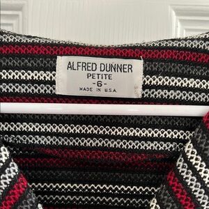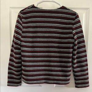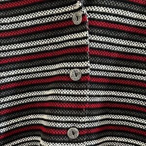 Chic cardigan with a button-up design. Features a mix of black, red, and white stripes. Perfect for layering. Excellent condition, size 6 Petit