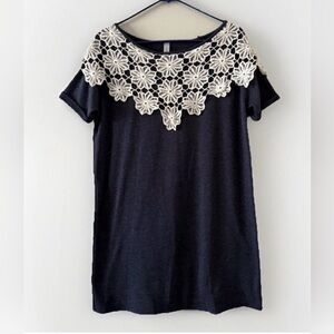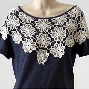 Navy Blue Dress Short Sleeve Crochet White Floral Accent Size M