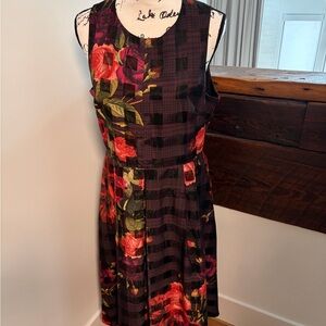 Make an unforgettable entrance in this stunning mixed-media tea-length dress from Ted Baker London. This unique piece perfectly blends modern style with romantic elegance, featuring a beautiful black and deep red floral rose pattern against a textured plaid burnout background. The sheer fabrication is layered over a lining, creating beautiful depth and dimension.
