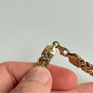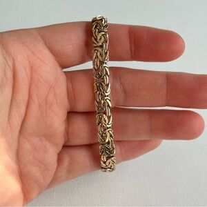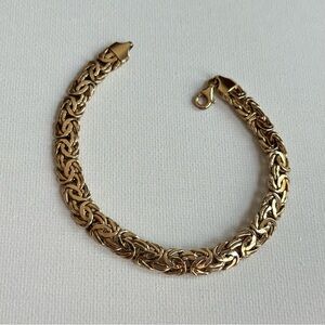 Vintage style 10K gold Byzantine chain bracelet, approximately 6.5 inches long with lobster clasp. Elegant, intricate woven links create a bold, timeless look that’s perfect for stacking or wearing solo. Beautiful warm yellow gold tone with great shine, substantial weight, and secure closure for everyday wear or special occasions. Ideal gift for her, anniversary jewelry, or classic statement piece for your collection. Keywords: Byzantine bracelet, gold chain bracelet, 7 inch bracelet, vintage style gold jewelry, statement gold bracelet, gift for her, Poshmark jewelry.
