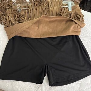 Faux suede fabric, pull on, crossover waist, fringe, built in shorts, stretch.