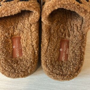 Cozy and stylish brown fuzzy slide sandals perfect for lounging. I like to wear them inside as slippers but they have a solid rubber bottom for outdoor use.