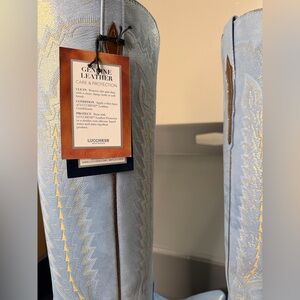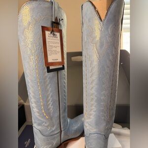 Elegant light blue boots with intricate stitching. Perfect for a stylish look.