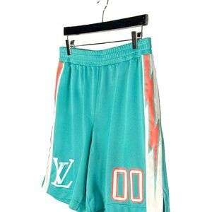 From the Spring Summer 2022 collection. Breathable turquoise blue mesh shorts with athletic cut. Elasticated waistband. Side slip pockets. White side panels with coral lightning graphic print. White LV logo and “00” numeric prints at front. Relaxed fit. Made in Italy.