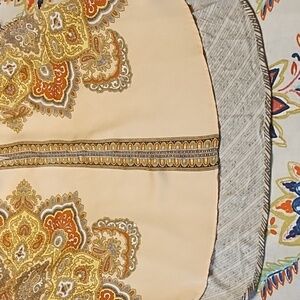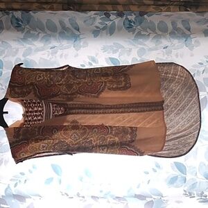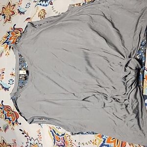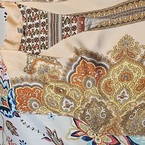Pretty light pinkish orange mandela print top by TINY by Anthropologie in a size extra small. It has a sheer front panel and a cotton back panel! The 2nd top is Tiny by Anthropologie in a size XS with a blue front panel that gathers at hem and a back soft multi colored print!