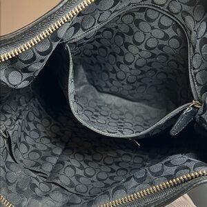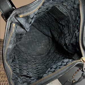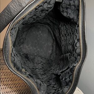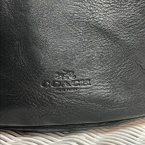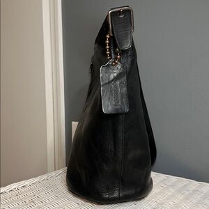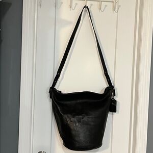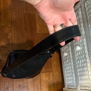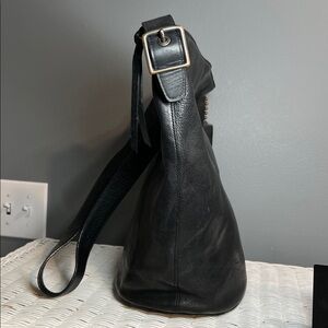Sleek black leather bag. Features a spacious interior. Includes a comfortable strap.