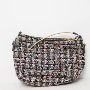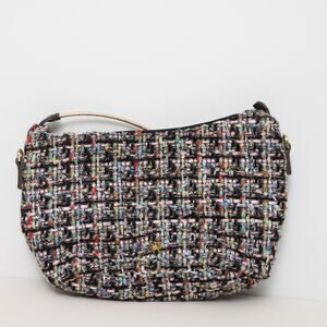 Multicolor tweed crossbody bag. Zipper closure. Zipper pockets. No strap. 8" W. 3 3/4" H. 3 3/4" D. Imported.