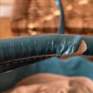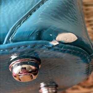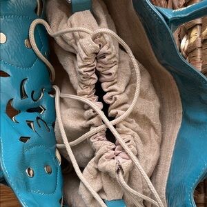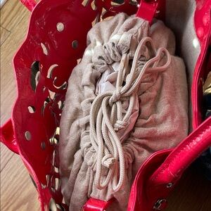 One each of a turquoise and a red Sondra Roberts cutout tote bags. Purchased in the early 2000's from Nordstrom Seattle. Each was used once and are being bundled together. Interior draw string fabric bags feature a side zipper and small pockets. Interior bags are made of fabric and can be snapped in and out of the interior vinyl bags