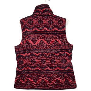 Stylish and warm, this red patterned vest is perfect for layering. Its intricate design adds a touch of elegance to any outfit.