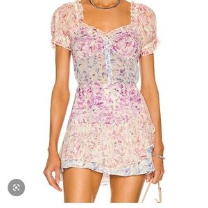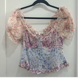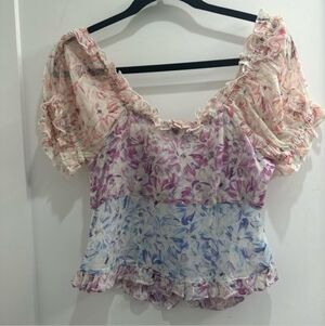 Charming floral top and skirt set with ruffle details. Features a mix of pink and purple hues. good condition !!