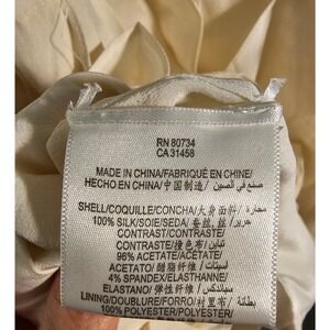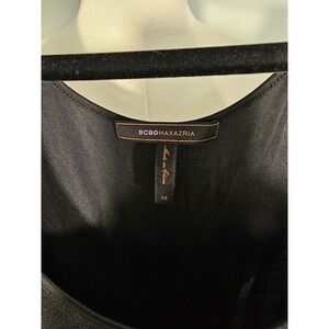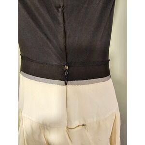BCBGMAXAZRIA sleeveless cocktail dress features a sophisticated color-blocked design with a sleek black bodice and a creamy off-white tiered ruffle skirt. The 100% silk shell offers a luxurious feel, while the tiered ruffles add playful movement and texture. A subtle metallic silver trim accents the waistline, and a hidden back zipper ensures a seamless fit. This elegant piece transitions effortlessly from dinner parties to special events.