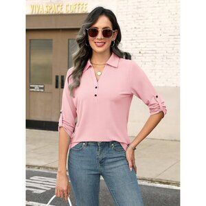 Features: Classic collared V-neck tunic with stylish 3/4 rolled sleeves, solid color, and a flattering relaxed fit. Made from high-quality, stretchy, skin-friendly fabric for all-day comfort. Perfect for looking put-together with minimal effort.