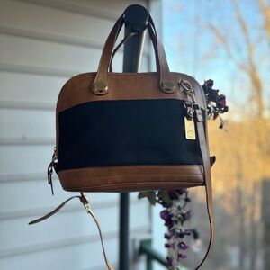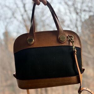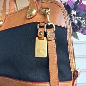 Step back into classic 90s style with this authentic Dooney & Bourke “Zip-Zip” Satchel from the iconic Cabriolet Collection. This timeless piece features a striking contrast between a durable black Cabriolet canvas body and rich British tan leather trim, giving it that effortlessly cool vintage Americana look.