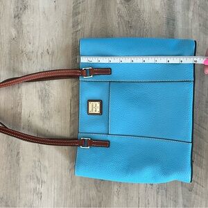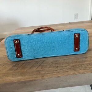 Dooney & Burke turquoise tote with rich brown leather straps.