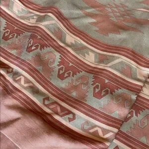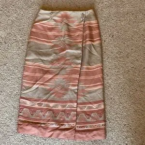 Stylish pencil skirt with southwestern pattern. Features a blend of pink and tan. Silk. True wrap with button and slide closure. Belt loops. See pics for measurements. In excellent condition. Fully lined.
