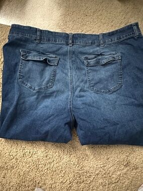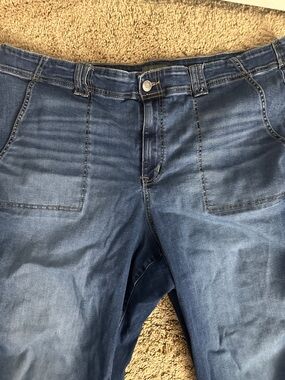 Dark blue denim jeans with classic stitching. Comfortable and versatile.