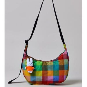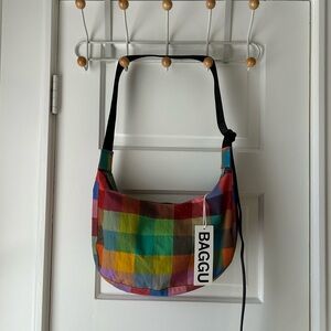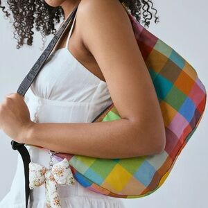 NWT Madras medium nylon crescent BAGGU by Urban Outfitters exclusive. Features include zippered closure and two interior pockets zippered pockets. Internal BAGGU logo key leash and adjustable crossbody strap. Perfect for the spring season coming with effortlessly casual outfits!