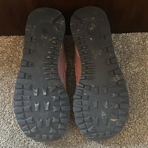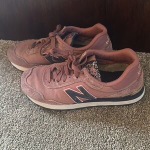 Stylish New Balance sneakers. Features pink upper with black accents. Comfortable and trendy design.