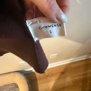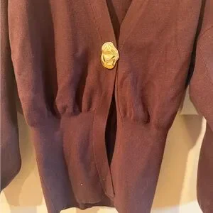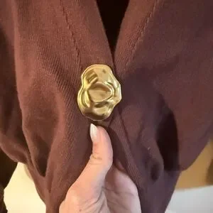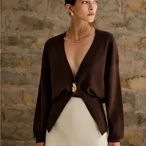 Chic deep brown cardigan with a stylish V-neck. Features a unique front clasp. Ideal for layering.