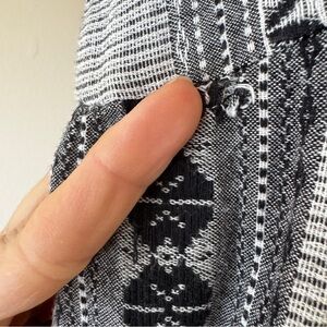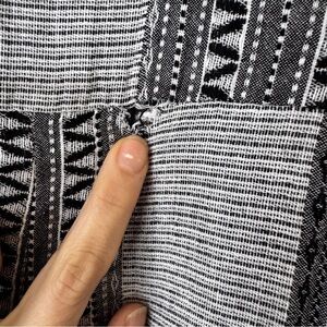 Beautiful En Creme boho maxi dress featuring a striking tribal stripe pattern in soft gray and black. Flattering empire waist silhouette with a flowy, elongating skirt and easy short sleeves.