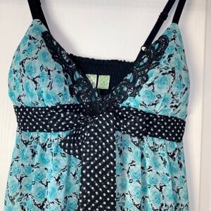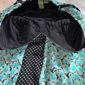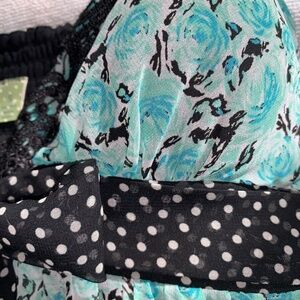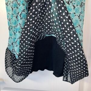 Features a turquoise floral print contrasted with black and white polka dot panels for a playful vintage-inspired look.