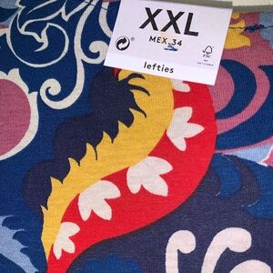 Robe Lefties neuve avec étiquettes, style portefeuille, avec un motif fleuri et arabesques colorées (bleu marine, rouge, jaune et bleu pâle).