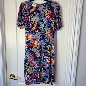 Brand new with tags Lefties wrap-style dress featuring a bold, colorful floral and paisley-inspired print in navy, red, yellow, and soft blue tones.