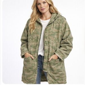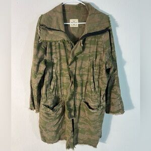 Tribe Kelly camo fray jacket in size M. Oversized fit with frayed hem and distressing throughout. Shoulder to bottom 34”. Good preloved condition.