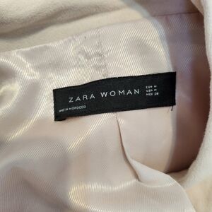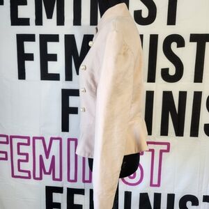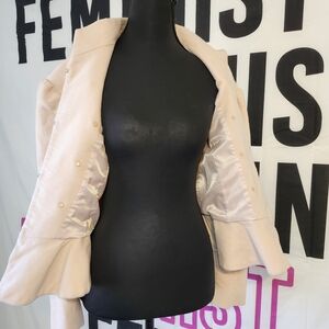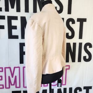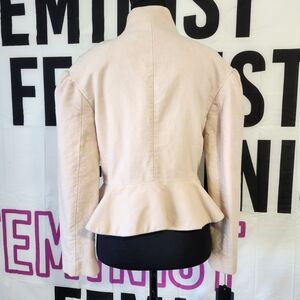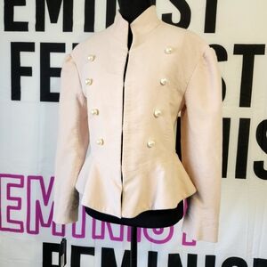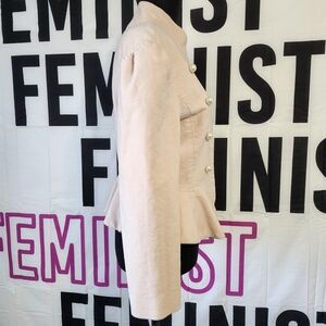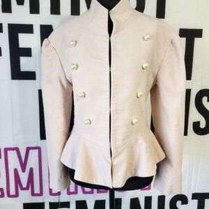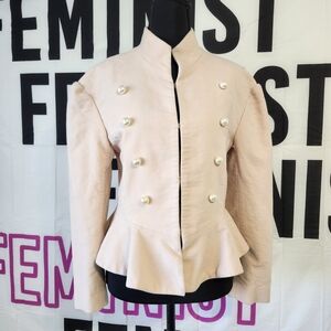 Chic Spring Creamy Blush Military jacket with a peplum hem, high collar and hidden closure front. Features elegant Military style pearl button details on a luxurious velvet material. Ideal for a sophisticated look.