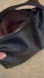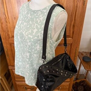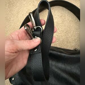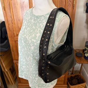 This stylish super soft black vegan leather studded shoulder bag is perfect for everyday as well as special occasions. It features high-quality silvertone metal studs that are securely attached for a durable finish. The bag has a soft supple texture that is easy to clean and maintain. The brown interior has ample room for all your items and a zip pocket for added security. The fixed studded strap has an 11 inch drop. Also included is a detachable strap with a 15 inch drop. In excellent condition.