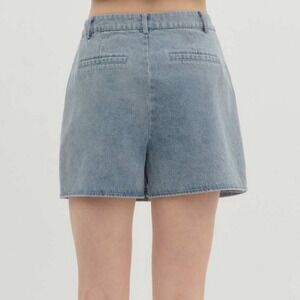 Entro Denim Dash Skort in a light wash blue. New with Tag. This stylish piece combines the classic look of a denim mini skirt with the comfort and coverage of built-in shorts. Crafted from a cotton-blend denim, it features a high-waisted fit, belt loops, functional side pockets, and decorative welt pockets at the back. The clean hem and structured silhouette make it a versatile choice for casual outings or pairing with western-style boots. Style number P26270.
