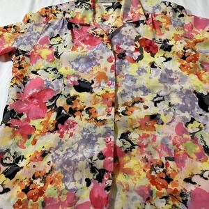 The Donn Kenny Classics Short Sleeve Polyester Button Up Collared Blouse in size S is a colorful floral patterned top suitable for casual occasions. Made from 100% polyester, this blouse features a collared neckline with button closure and a regular fit. The cap sleeves add a stylish touch to this basic blouse from the brand Donn Kenny, perfect for all seasons.