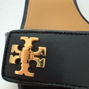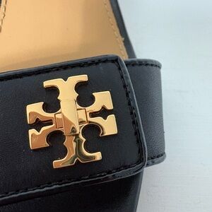 Tory Burch Kira Black Leather Block Heel Sandals Gold Logo 65mm (Size 8.5)