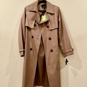 Be undercover-chic in this polished double-breasted trench designed with all the classic details like oversized lapels, belted cuffs and a defining tie belt. Quiet luxury meets stealth cool. Water repellant. New with tags. Back vent, storm flaps. Tortoise look buckles.
