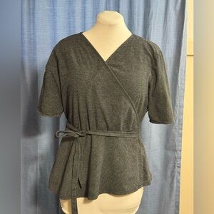 Flattering wrap top from LOFT in a classic black and white micro-stripe. This is a genuine wrap style with an adjustable waist tie for a customizable fit. Features a V-neckline, short sleeves, and a softly flared peplum hem that creates a feminine silhouette.
