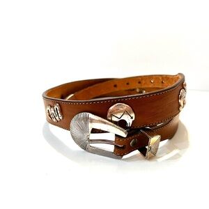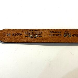 Silver Creek Unisex caramel brown leather belt featuring silver & rose fetish accents and a unique buckle design. Perfect for your western mood. The leather is in perfect condition, the metal belt keeper/loop has some tarnish as shown.