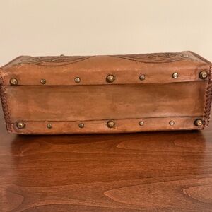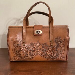 Charming tan brown satchel with floral embossing. Features sturdy handles and secure clasp. Ideal for stylish outings.Measures: 8 inches ht. and 12.5 inches wdth. Bottom measures: 4.5 inches and 12.5 inches. Excellent condition for vintage collection.