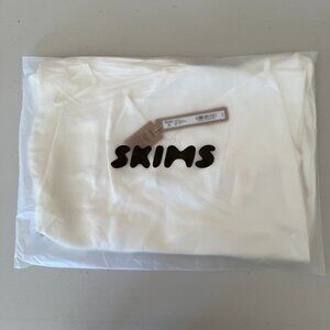The product is a new, size medium Skims silk sleep dress in ivory color. Featuring a V-neck design, this long slip is perfect for women looking for elegant and comfortable sleepwear. Made of luxurious silk, this dress is sure to provide a soft and luxurious feel for a good night's rest.