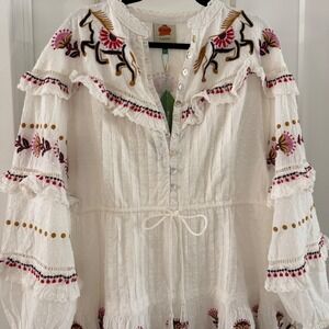 Embroidered Horses Ruffled Mini Dress in Off-White showcases the brand's signature bohemian flair with intricate horse and floral embroidery throughout. This airy piece features a button-down bodice with mother-of-pearl buttons, a drawstring waist for a customizable fit, and tiered ruffled sleeves that add romantic volume. Crafted from a delicate swiss dot fabric with ladder stitch detailing and scalloped lace trim, it offers a whimsical aesthetic perfect for coastal or festival wear.