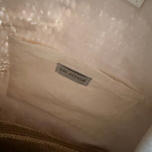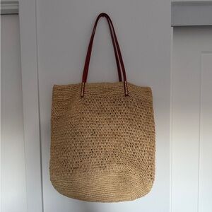 Woven tote bag with brown leather straps and small tote bag inside that can be removed to use on its own. Bag is lined with an interior pocket for phone/keys. Perfect for the beach or around town. Excellent condition, only used a few times. No visible signs of wear.