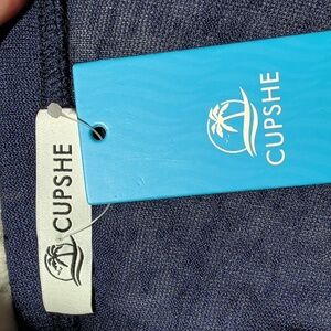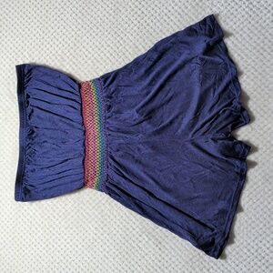 Cupshe Blue Strapless Smocked Cover Up Playsuit Romper. Size large. NWT, never worn, no damage. Dark blue color with a rainbow colored smocked waist. Waist has a tie with tassels. Lightweight almost sheer fabric with a lot of stretch. Perfect beach cover up!