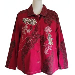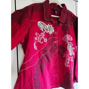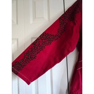 Denim & Co 2X Red Y2K Embroidered Jean Jacket Animal Print Button Boxy Western