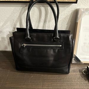 Sleek black leather tote. Features dual handles and tassel accent. Ideal for daily use.