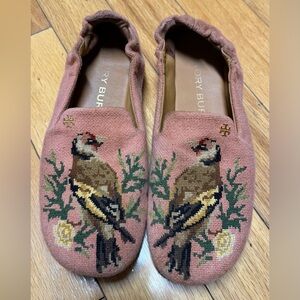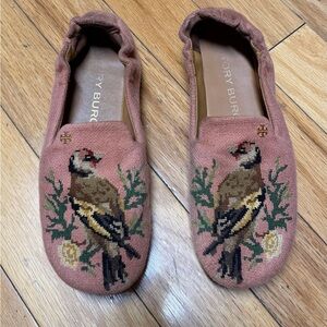 Charming Tory Burch loafers featuring bird and floral embroidery. Soft pink fabric in used condition. This has been carefully washed.