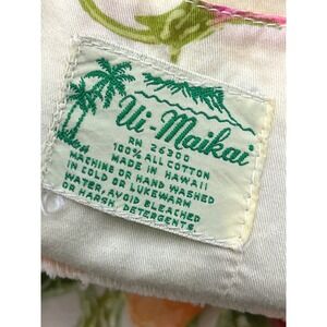 Vintage Ui-Maikai Hawaiian muumuu dress crafted from breathable 100% cotton in a soft cream base. This authentic Made in Hawaii piece features a vibrant tropical hibiscus and floral print in shades of pink, orange, and purple. Designed with a classic yoke neckline, short sleeves, and a relaxed shift silhouette, it offers a comfortable and airy fit perfect for summer lounging or resort wear. The hem is finished with a decorative geometric border that complements the lush botanical pattern.
