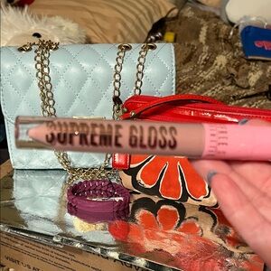 Elevate your style with this chic blue quilted bag. Featuring a sophisticated chain strap, it's perfect for any occasion. Fashion bag with EUC Coach wristlet NIB Jeffree Star Supreme Gloss and Marc Jacob Silicone bracelet