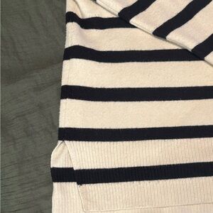 Abercrombie & Fitch Cream and Black Striped Sweater. Has slits at the side to provide more room around hips. Slight staining on right sleeve, shown in last photo. Could probably be fixed. Size XXL