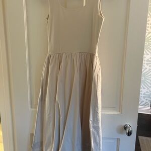 Chic cream midi dress with a sleeveless design. Perfect for versatile styling.