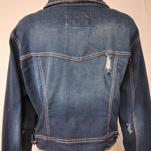 Amethyst brand women's denim jacket. The jacket is typically made from a blend of cotton and spandex, offering a comfortable, stretchy fit. It features a blue denim wash and a distressed style with minor fraying and tears visible on the front. The jacket has a classic fit, a collared neckline, and long sleeves.