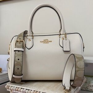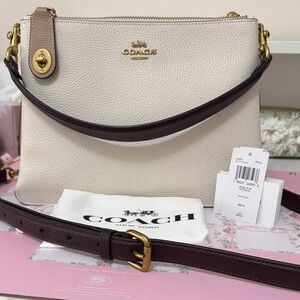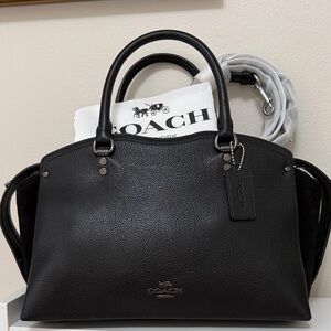 Chic and versatile pebble leather bag. Features iconic logo detail. Ideal for daily use. Can be worn two ways unlatched at top can be a tote bag or cinched with clasp can be more like a bucket bag. Snap closure. No rips, tears or stains. Inside is clean. See pictures for measurements and condition.
